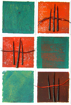 . . . from the Imprints series of block prints. As the title implies, actual thorns from the Hawthorn tree hold the paper strands. Private collection