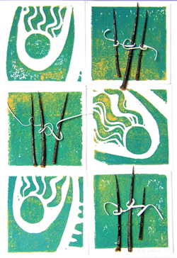 . . . from the Imprints series of block prints. Actual thorns from the Hawthorn tree hold the paper strands, reminiscent of a spring dance around the Maypole.