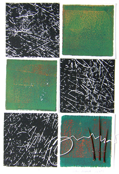 . . . from the Imprints series of block prints. Actual thorns from the Hawthorn tree hold a paper strand that echoes the scratched surface of the black ink.