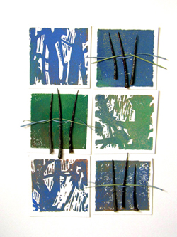 . . . from the Imprints series of block prints. Actual thorns combine with small prints of hawthorn trees. Private collection