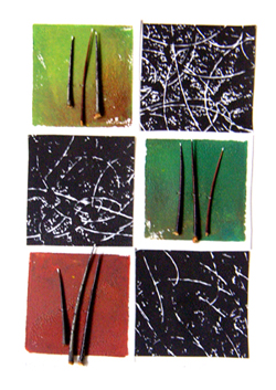 . . . from the Imprints series of block prints. Actual thorns from the hawthorn tree are tipped with white ink. Private collection