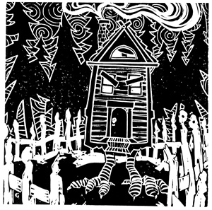 . . . part of a series inspired by the music of Modest Moussorgsky's Pictures at an Exhibition. This handmade linoleum block print represents IX. La Cabane sur des pattes de poule (The Hut on Fowl's Legs). The hut, deep in the forest and perched on chicken legs, is inhabited by Baba Yaga, the fearsome witch of Russian folklore and children's fairy tales.