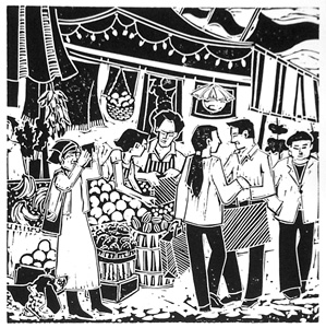 . . . part of a series inspired by the music of Modest Moussorgsky's Pictures at an Exhibition. This handmade linoleum block print represents VII. Limoges. Le Marche (The Marketplace at Limoges).