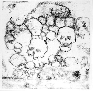 . . . part of a series inspired by the music of Modest Moussorgsky's Pictures at an Exhibition. This handmade monotype represents the second section of Catacombe, titled Cum Mortuis in Lingua Mortua (With the Dead in a Dead Language). Moussorgsky's margin notes read, "The creative genius of Hartmann leads me to the skulls and invokes them; the skulls begin to glow."