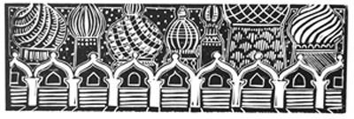 . . . part of a series inspired by the music of Modest Moussorgsky's Pictures at an Exhibition. This handmade linoleum block print represents one of four promenade passages in the music.