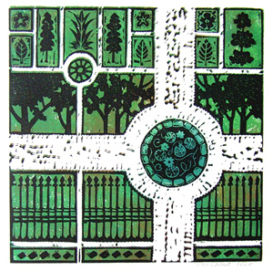 . . . part of a series inspired by the music of Modest Moussorgsky's Pictures at an Exhibition. This handmade linoleum block print represents III. Tuileries and was printed in both a black and white and a two-color version.