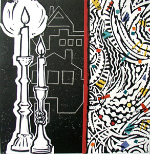 . . . one from a series of six images, each a visual interpretation of a verse by Wallace Stevens. This is a hand pulled linoleum block print with collage elements.